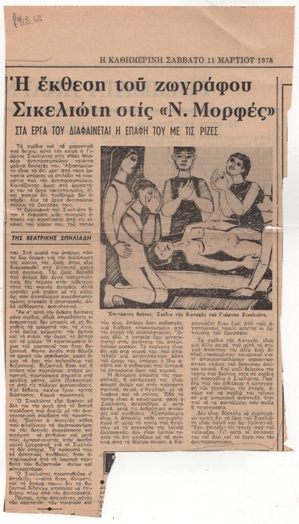Απόκομμα της εφημερίδας “Η Καθημερινή” (11/03/1978), όπου δημοσιεύεται κριτική της Βεατρίκης Σπηλιάδη για την ατομική έκθεση του Γιώργου Σικελιώτη στην Αθήνα.