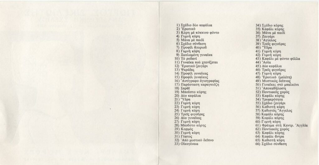 Κατάλογος έργων της αναδρομικής έκθεσης σχεδίου του Γιώργου Σικελιώτη στην Γκαλερί “Νέες Μορφές” στην Αθήνα.
