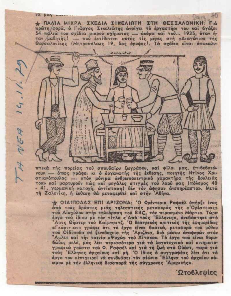 Απόκομμα της εφημερίδας “Τα Νέα” (14/11/1979) όπου δημοσιεύεται αναγγελία της έκθεσης του Γιώργου Σικελιώτη με τίτλο “Παλιά μικρά σχέδια Σικελιώτη στη Θεσσαλονίκη” στη Θεσσαλονίκη.