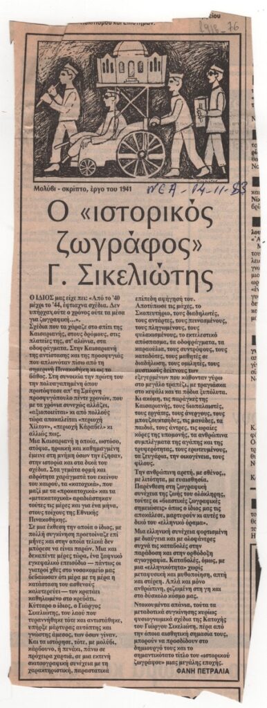 Απόκομμα της εφημερίδας “Τα Νέα” (14/11/1983), όπου δημοσιεύεται, στα ελληνικά, κριτική της Φάνης Πετραλιά για την έκθεση σχεδίων του Γιώργου Σικελιώτη από την περίοδο 1940-1944 στην Αθήνα.
