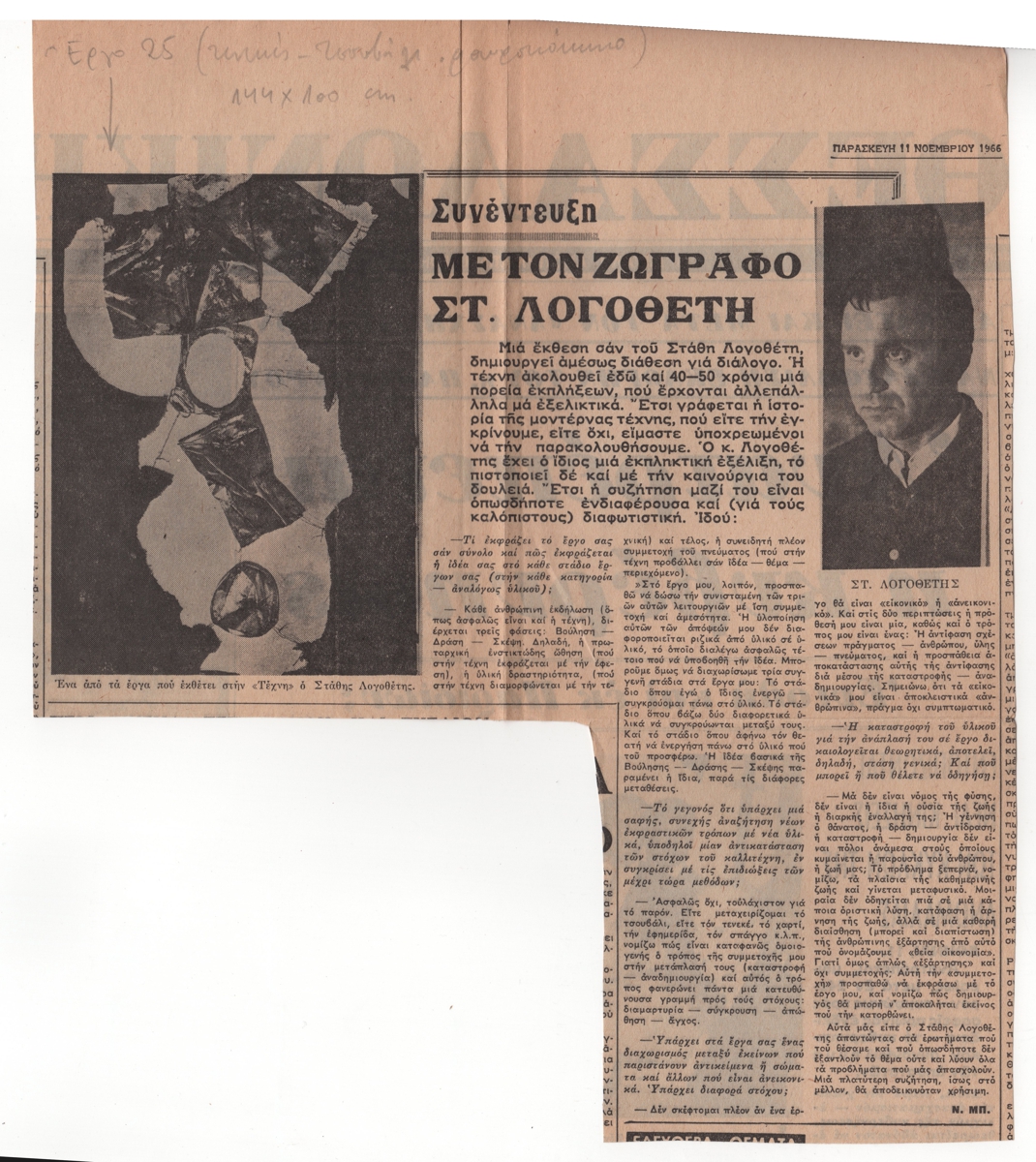 Απόκομμα, έντυπο, χαρτί, 29,0×25,0 εκ., όπου δημοσιεύεται, στα ελληνικά, συνέντευξη του ζωγράφου Στάθη Λογοθέτη στον Ν. Μπ. με αφορμή την έκθεσή του στην Θεσσαλονίκη το 1966. Επάνω, επιγραφή με τα στοιχεία του αναπαραγώμενου έργου.