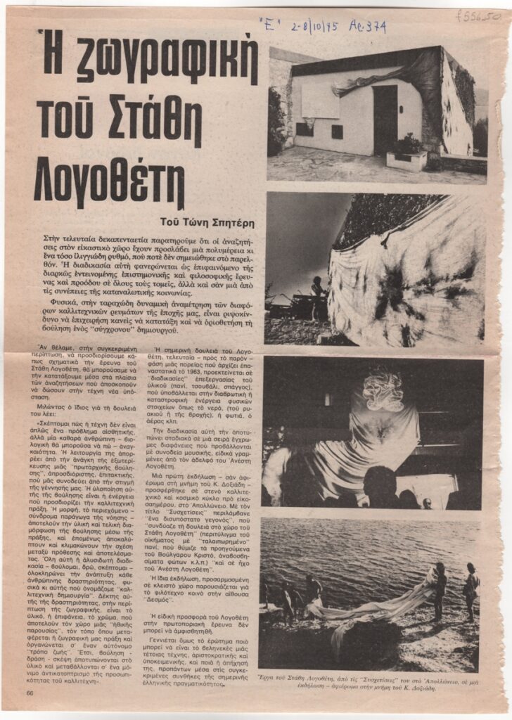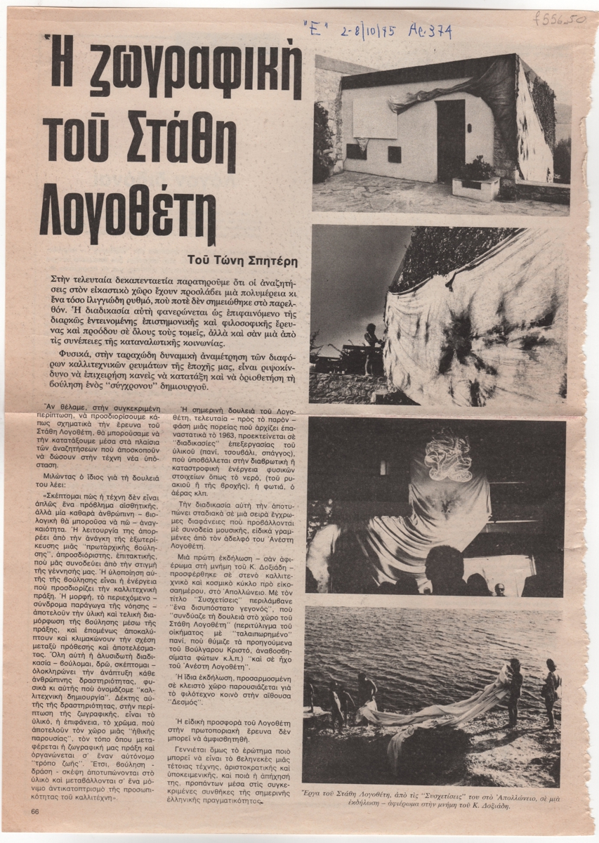 Απόκομμα, έντυπο, στα ελληνικά, χαρτί, 33,5×24,0 εκ. Άρθρο του Τώνη Σπητέρη για τον ζωγράφο Στάθη Λογοθέτη και το έργο του. Περιέχει απόσπασμα συνέντευξης του καλλιτέχνη. Επάνω, επιγραφή με τα στοιχεία της δημοσίευσης. Στην πίσω όψη απόσπασμα συνέντευξης του Ιάννη Ξενάκη στον Ανδρέα Δεληγιάνη και άρθρο του Α. Δ. Σκιαδά με τίτλο “Λόγον διδόναι” στη στήλη “Διαπιστώσεις”.