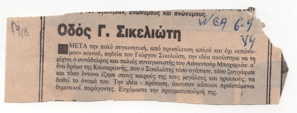 Απόκομμα της εφημερίδας “Τα Νέα” (06/09/1984), όπου δημοσιεύεται είδηση σχετικά με την πρόταση του Ασσαντούρ Μπαχαριάν να δοθεί το όνομά του σε δρόμο της Καισαριανής.