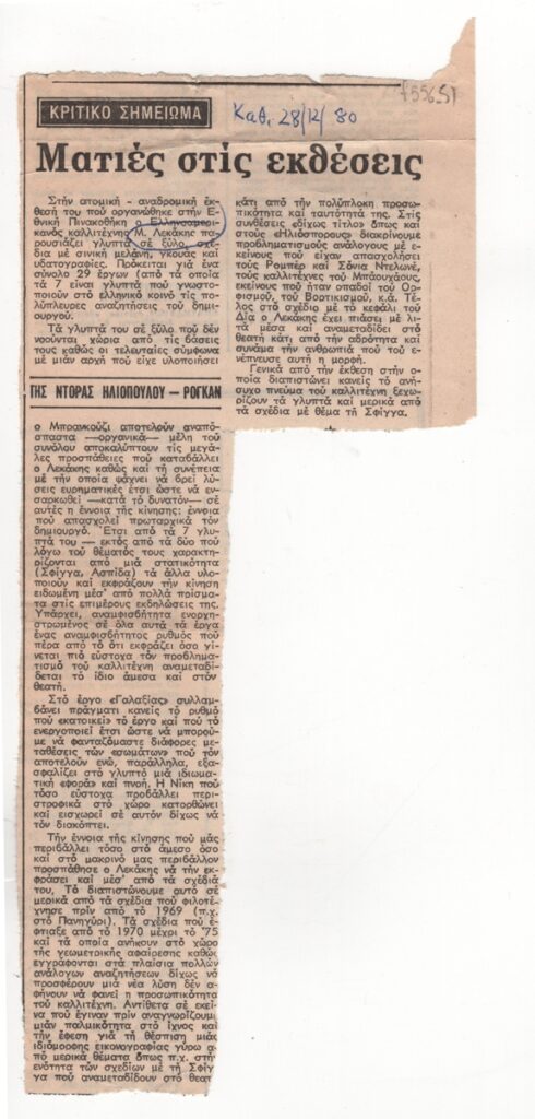 Απόκομμα, έντυπο, στα ελληνικά, χαρτί, 25,5×11,5 εκ. Κριτική της Ντόρας Ηλιοπούλου-Ρογκάν για την ατομική έκθεση γλυπτικής του ελληνοαμερικανού καλλιτέχνη Μ. Λεκάκη. Το δημοσίευμα εντάσσεται στη στήλη “Ματιές στις εκθέσεις”. Επάνω, σημείωση με τα στοιχεία της δημοσίευσης.