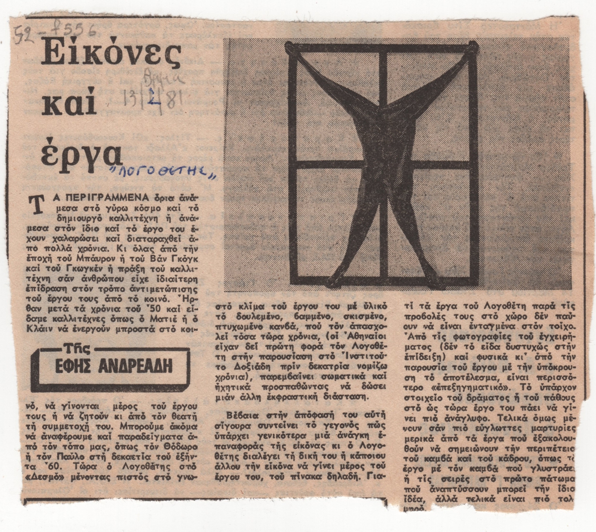 Απόκομμα, έντυπο, στα ελληνικά, χαρτί, 12,6×15,7 εκ., όπου δημοσιεύεται κριτική της Έφης Ανδρεάδη για την ατομική έκθεση έργων του Στάθη Λογοθέτη στην Αθήνα το 1981.Επάνω επιγραφή με τα στοιχεία της δημοσίευσης και το όνομα του καλλιτέχνη.