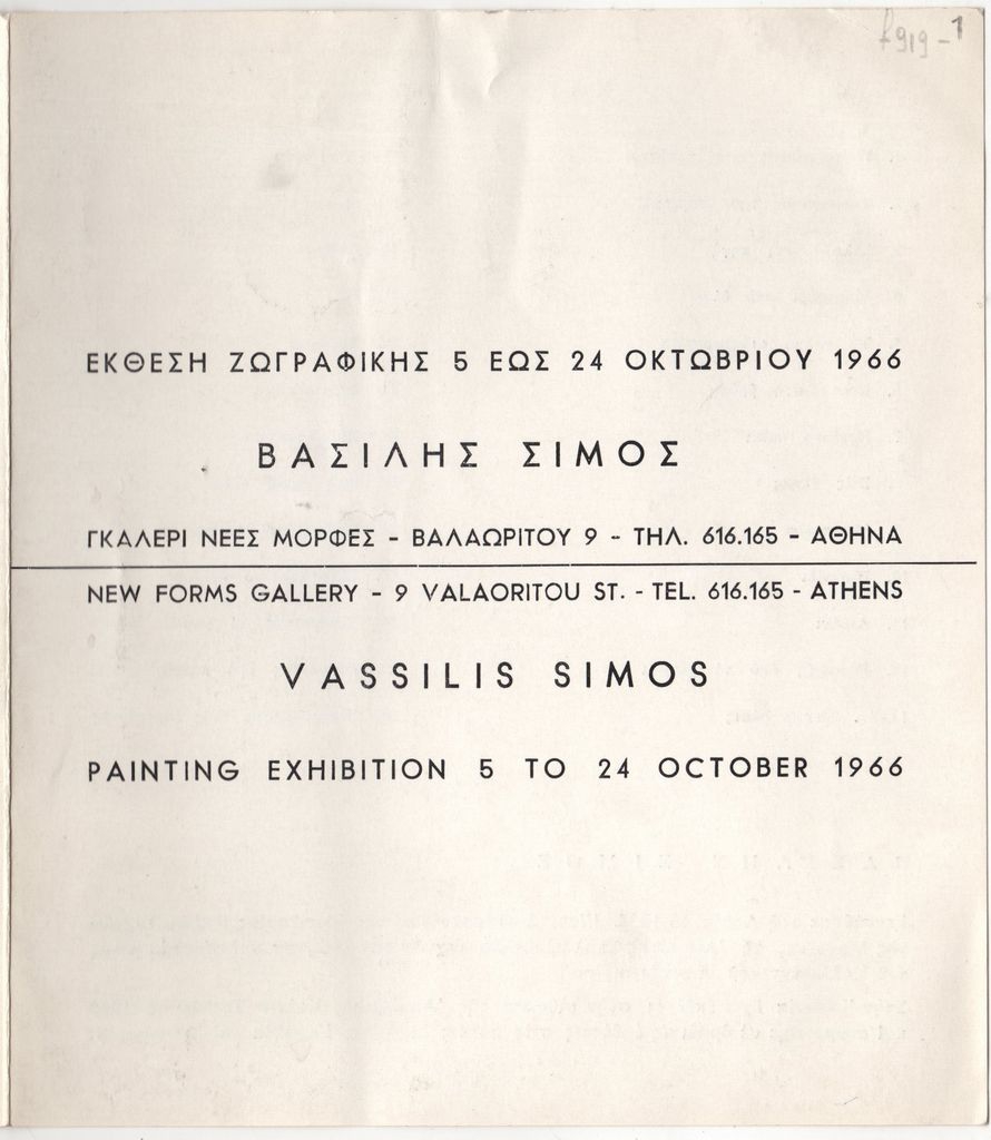 Έντυπο, στα ελληνικά και στα αγγλικά, δίπτυχο, χαρτόνι ιλουστρασιόν, 20,0×17,5 εκ., της ατομικής έκθεσης ζωγραφικής του Βασίλη Σίμου στην Αθήνα το 1966. Περιέχει κατάλογο των έργων της έκθεσης και σύντομο βιογραφικό καλλιτέχνη. Εσωτερικά, εικονογράφηση.