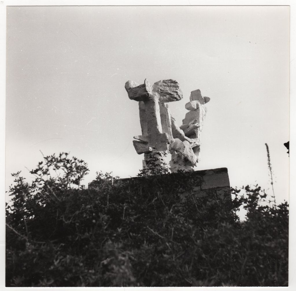 Φωτογραφία, α/μ, φωτογραφικό χαρτί, 18,0×18,2 εκ. Αναπαραγωγή έργου της Γαβριέλλας Σίμωσι τοποθετημένου στην ύπαιθρο.
