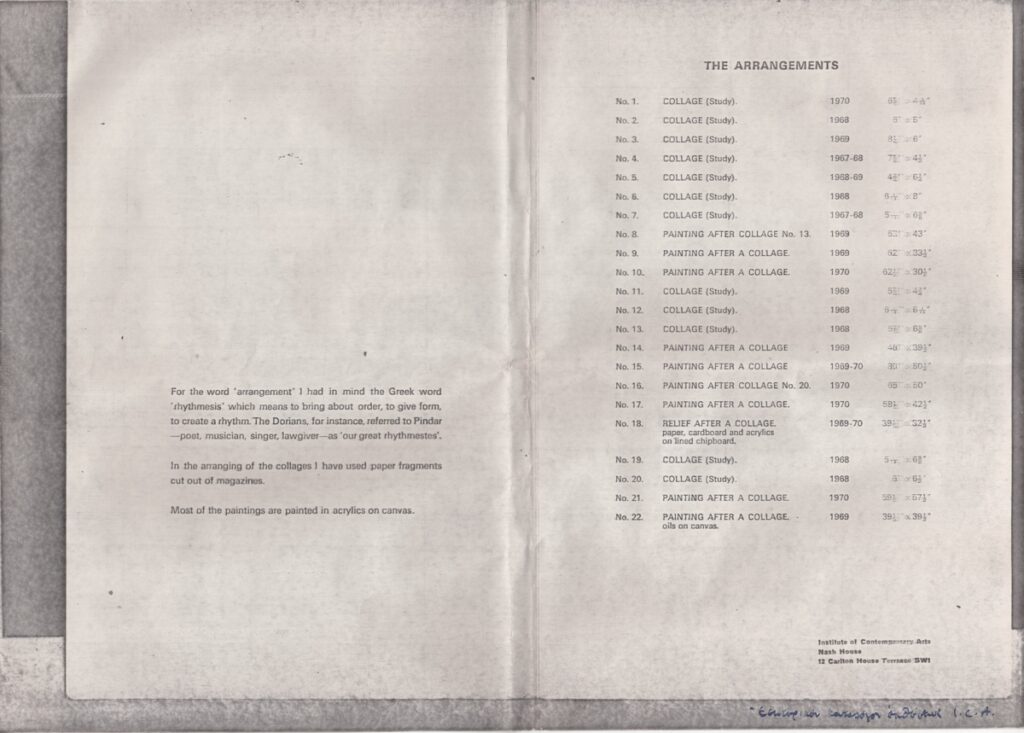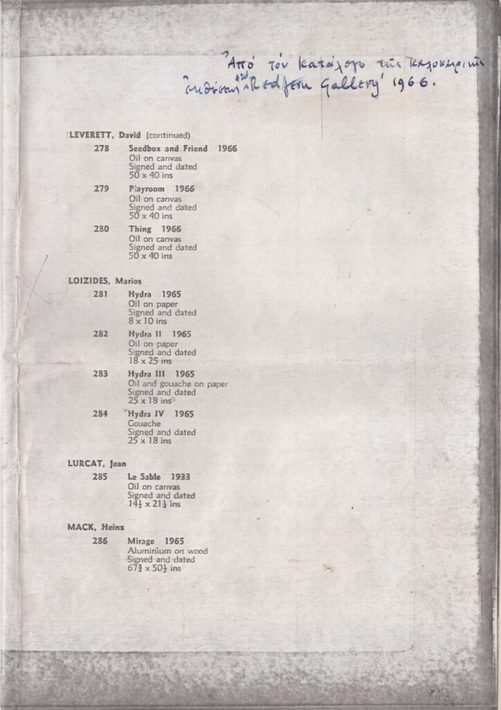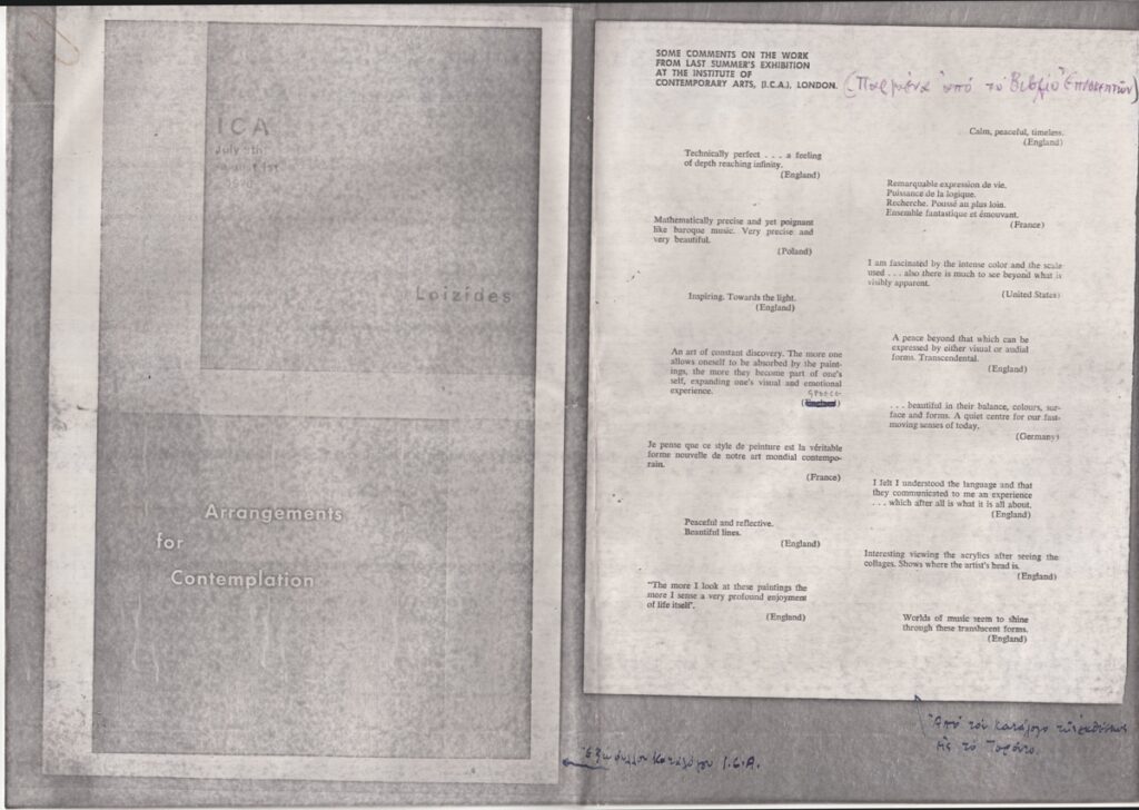 Φωτοαντίγραφο αποκομμάτων τριών εντύπων έκθεσης, στα αγγλικά, χαρτί, 4 φφ., 29,7×21,0 εκ. Πρόκειται για αποκόμματα εντύπων από την ομαδική έκθεση στην οποία συμμετείχε ο καλλιτέχνης στο Λονδίνο το 1966 (εξώφυλλο του καταλόγου της έκθεσης και δύο σελίδες του καταλόγου έργων διαφόρων καλλιτεχνών) και το 1970 (εξώφυλλο και εσωτερική σελίδα του καταλόγου), καθώς και μία σελίδα από έντυπο της ατομικής έκθεσης του καλλιτέχνη στο Τορόντο με κείμενα από το βιβλίο επισκεπτών της έκθεσης του καλλιτέχνη στο Λονδίνο την ίδια χρονιά.