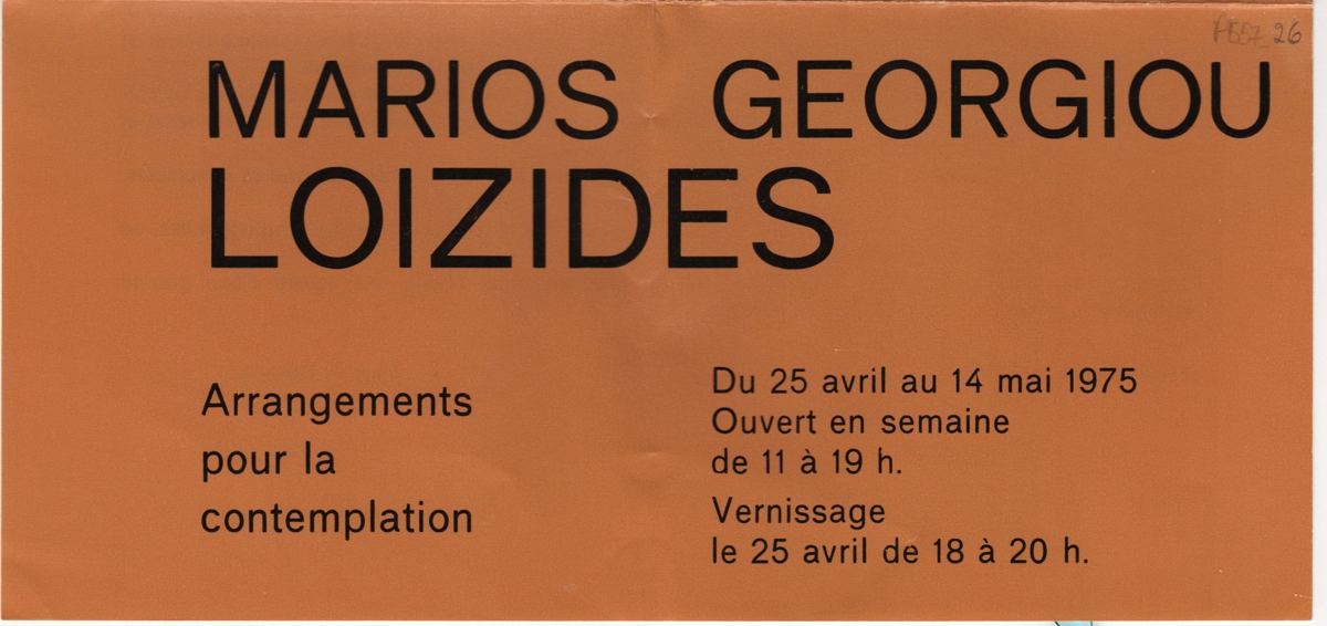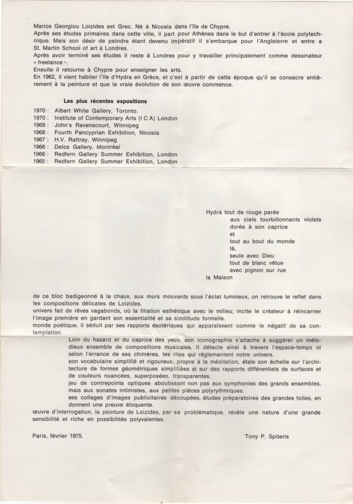 Έντυπο έκθεσης, στα γαλλικά, τρίπτυχο, ιλουστρασιόν χαρτί, 10,5×22,0 εκ. Έντυπο της ατομικής έκθεσης του Μάνου Λοϊζίδη στις Βρυξέλλες το 1975. Περιέχει σύντομο βιογραφικό και κατάλογο πρόσφατων εκθέσεων του καλλιτέχνη και κείμενο του Τώνη Σπητέρη. Εικονογραφείται με αναπαραγωγή έργου στο οπισθόφυλλο.