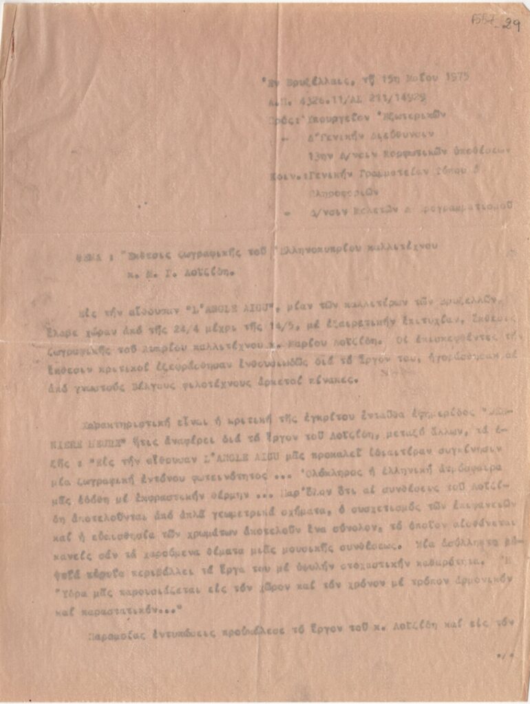Κείμενο, δακτυλόγραφο, στα ελληνικά, χαρτί, 2 φφ., 28,0×21,5 εκ. Έγγραφο του Έλληνα πρέσβη στις Βρυξέλες κ. Ιάσονα Α. Δρακούλη προς το Υπουργείο Εξωτερικών σχετικά με την ατομική έκθεση ζωγραφικής του Μάριου Λοϊζίδη στις Βρυξέλες το 1975. Περιέχει αποσπάσματα κριτικών για την έκθεση που δημοσιεύτηκαν στον βελγικό τύπο.