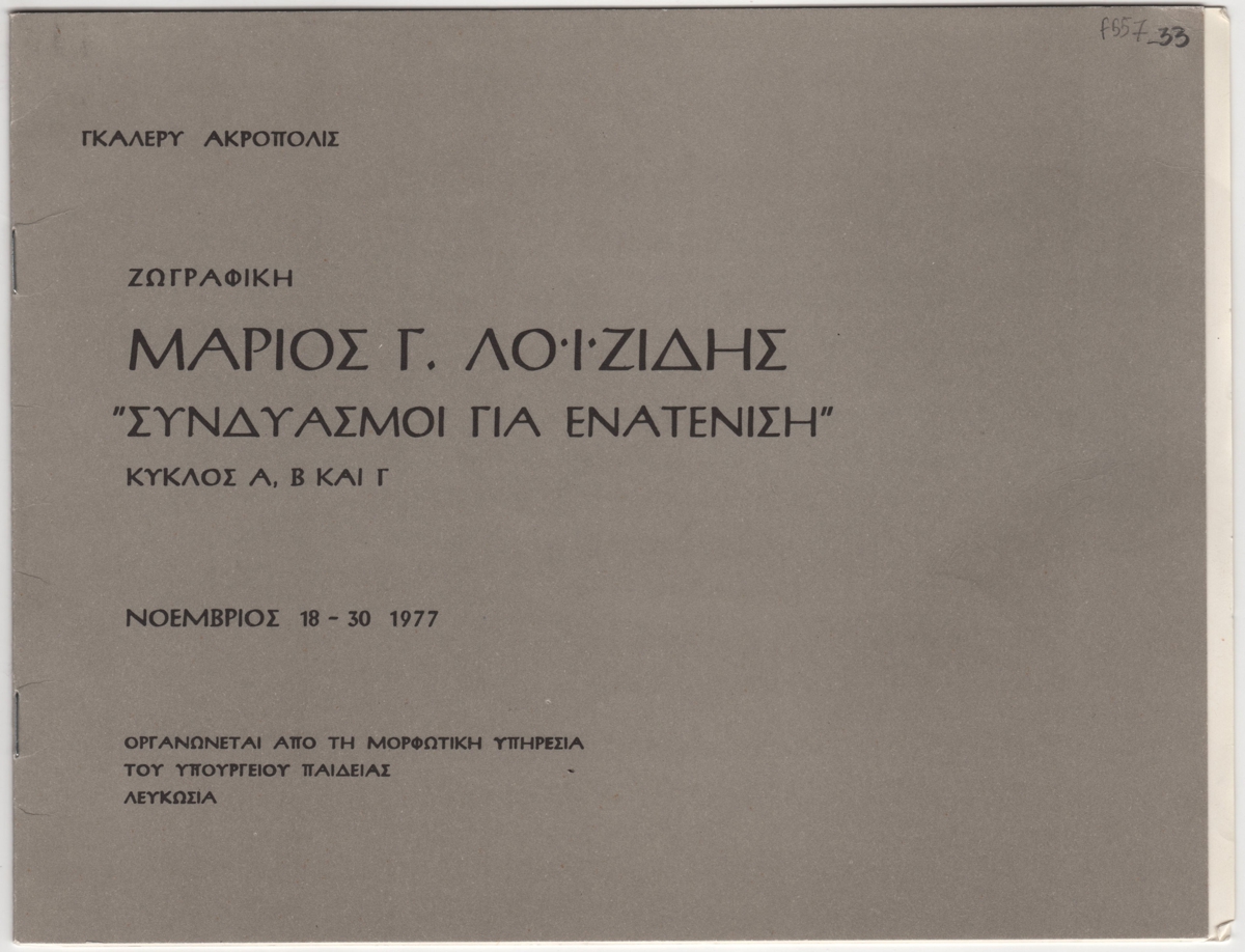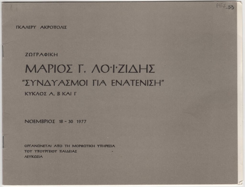 Έντυπο έκθεσης, στα ελληνικά, χαρτόνι και χαρτί, 18,0×24,6 εκ. Έντυπο της ατομικής έκθεσης του Μάριου Λοϊζίδη στη Λευκωσία το 1977. Περιέχει αφιέρωση της έκθεσης στον Αρχιεπίσκοπο Μακάριο από τον καλλιτέχνη και κριτικές για το έργο του καλλιτέχνη από τους: Michel Troche, συμβούλου του υπουργείου πολιτισμού της Γαλλίας, με τίτλο “Σπίτι και ζωγραφική”, Τώνη Σπητέρη, Roger Maybank και Maurits Bilcke. Επίσης, κείμενο του ίδιου του καλλιτέχνη για το έργο του. Στο οπισθόφυλλο βιογραφικό σημείωμα και κατάλογος εκθέσεων του καλλιτέχνη.