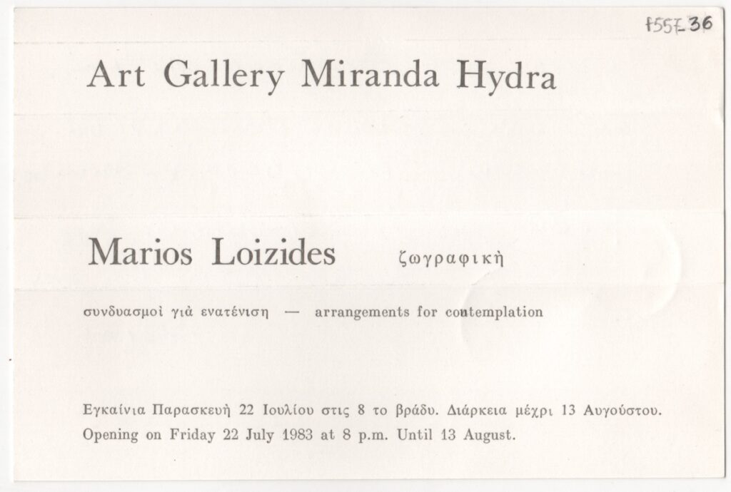 Έντυπο, στα ελληνικά και αγγλικά, μονόφυλλο, χαρτόνι, 11,5×17,2 εκ. Πρόσκληση της ατομικής έκθεσης ζωγραφικής του Μάριου Λοϊζίδη στην Ύδρα το 1983. Στην πίσω όψη χειρόγραφη πρόσκληση του καλλιτέχνη προς τον Τώνη Σπητέρη.