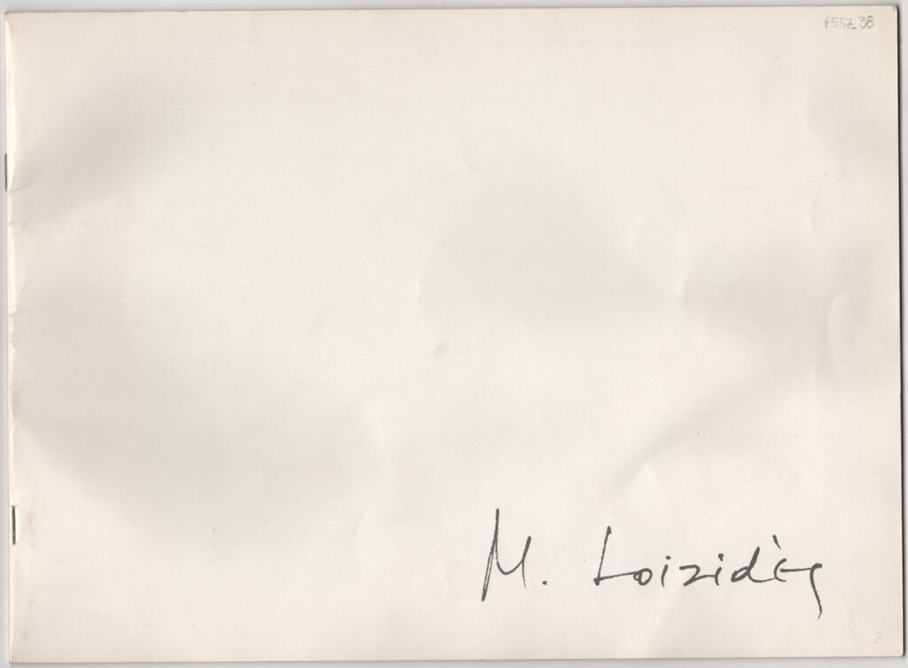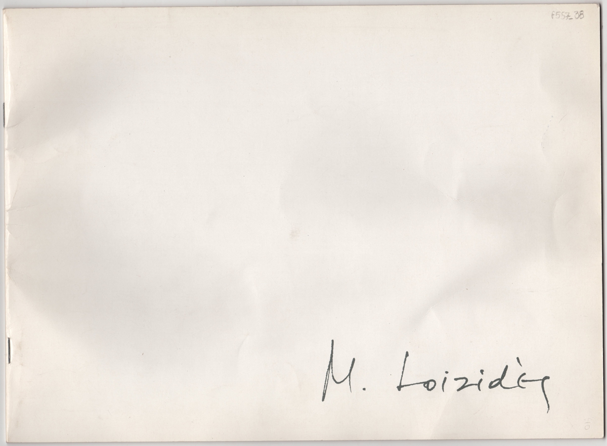 Έντυπο, στα αγγλικά και γαλλικά, πολυσέλιδο, ιλουστρασιόν χαρτόνι και χαρτί, 22,0×30,0 εκ. Κατάλογος της ατομικής έκθεσης του Μάριου Λοϊζίδη στην Ύδρα το 1983. Περιέχει αναπαραγωγή ιδιόχειρου κειμένου του Jean Pierre van Tieghem, προέδρου της International Association of Art Critics (AICA) με τίτλο “Opus 1 pour les ARRANGEMENTS FOR CONTEMPLATION de Marios Loizides) και κείμενα της αρχαιολόγου και ιστορικού της τέχνης Αθηνάς Σχοινά, του Τώνη Σπητέρη, του Michel Toche, δημοσιευμένο στο περιοδικό “Jalons et actualitès” το 1978, του Roger Maybank, του Philippe d’Arschot, του Maurits Bilcke δημοσιευμένο στην φλαμανδική εφημερίδα Spectator, του K. Lara, δημοσιευμένου στο περιοδικό “4 Millions 4” το 1980. Στην τελευταία σελίδα κατάλογος έργων έκθεσης με χειρόγραφες διορθώσεις, βιογραφικό σημείωμα και κατάλογος εκθέσεων του καλλιτέχνη.