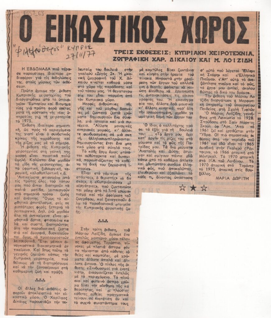 Απόκομμα εφημερίδας, στα ελληνικά, χαρτί, 21,5×17,8 εκ. Κριτική της Μαρία Δωρίτη για την έκθεση κυπριακής χειροτεχνίας και τις ατομικές εκθέσεις ζωγραφικής του Χαρίλαου Δίκαιου και του Μάριου Λοϊζίδη στη Λευκωσία το 1977. Το δημοσίευμα εντάσσεται στη στήλη “Ο εικαστικός χώρος”