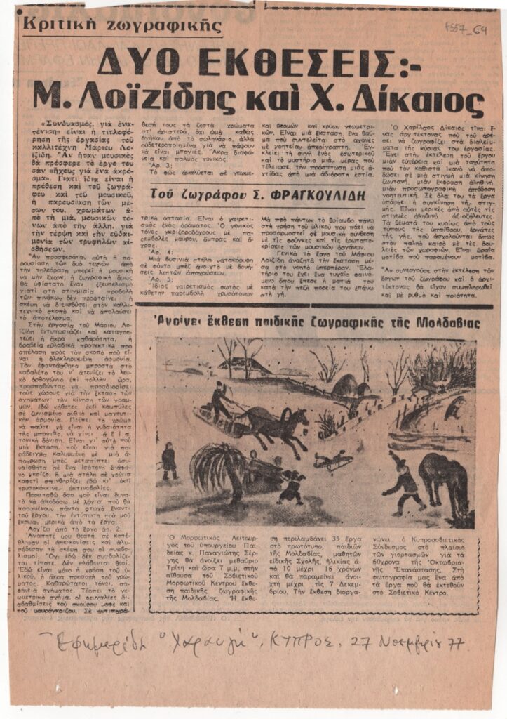 Απόκομμα εφημερίδας, στα ελληνικά, χαρτί, 27,5×19,0 εκ. Κριτική του ζωγράφου Σ. Φραγκουλίδη για τις ατομικές εκθέσεις ζωγραφικής του Μάριου Λοϊζίδη και του Χαρίλαου Δίκαιου στη Λευκωσία το 1977. Το δημοσίευμα εντάσσεται στη στήλη “Κριτική ζωγραφικής”. Στο ίδιο απόκομμα περιλαμβάνεται επίσης άρθρο για τα εγκαίνια της έκθεσης παιδικής ζωγραφικής της Μολδαβίας στη Λευκωσία. Εικονογραφείται με αναπαραγωγή έργου. Κάτω επιγραφή με τα στοιχεία της δημοσίευσης.