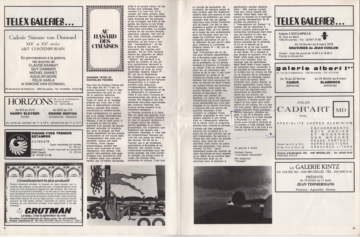 Τεύχος περιοδικού, στα γαλλικά, χαρτί, 28,5×21,8 εκ. Περιέχει κριτική των εκθέσεων της περιόδου από τον Stéphane Rey. Η κριτική αφορά τις ατομικές εκθέσεις των: Gustave Camus, Rik Slabbinck, Jean Timmerman, René Mels, Μάριου Λοϊζίδη, Charles Delporte και Pierre Petit στις Βρυξέλες το 1978. Εικονογραφείται με αναπαραγωγές έργων.