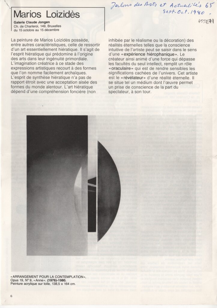 Απόκομμα περιοδικού, στα γαλλικά, χαρτί, 2 φφ., 29,6×21,1 εκ. Δημοσίευμα toy Philippe d’Arschot για την ατομική έκθεση του Μάριου Λοϊζίδη στις Βρυξέλες το 1980. Εικονογραφείται με αναπαραγωγές έργων.