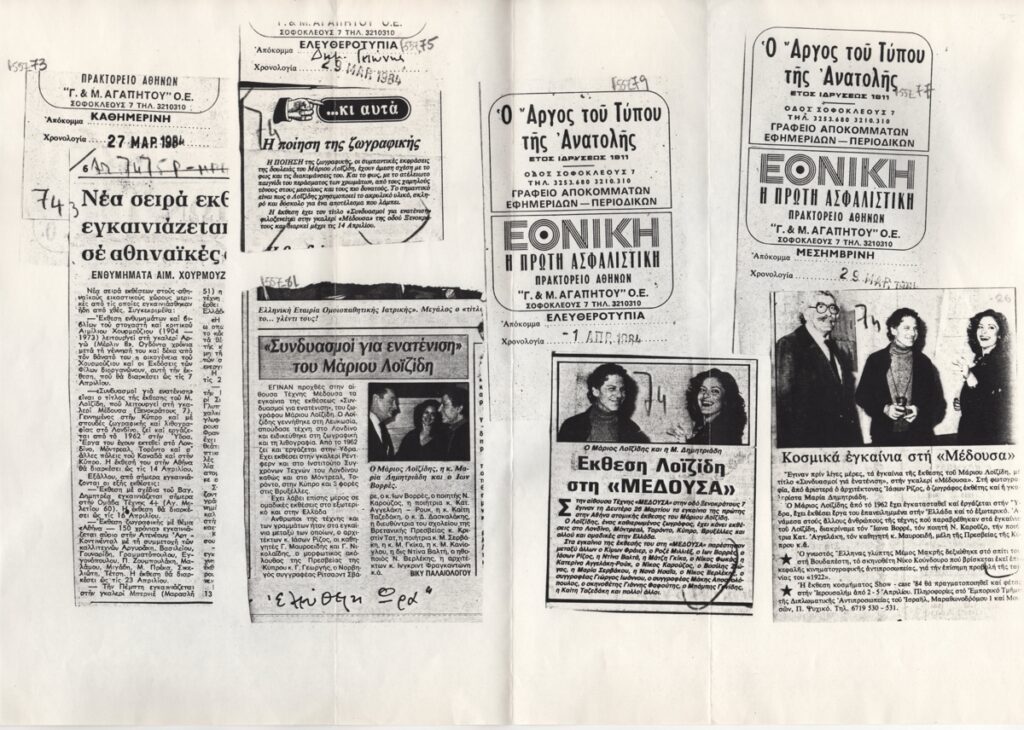 Φωτοαντίγραφο αποκόμματος, έντυπο, στα ελληνικά, χαρτί, 21,6×6,5 εκ. Απόσπασμα δημοσιεύματος για τις εκθέσεις που διοργανώθηκαν στην Αθήνα τον Μάρτιο του 1984. Αναφέρονται η έκθεση ενθυμημάτων και βιβλίων του στοχαστή και κριτικού Αιμίλιου Χουρμούζιου, η ατομική έκθεση ζωγραφικής του Μάριου Λοϊζίδη, η ατομική έκθεση με σχέδια του Βαγγέλη Δημητρέα και η ομαδική έκθεση με θέμα “Αθήνα – 150 χρόνια”. Επάνω απόκομμα της εταιρία αποδελτίωσης “Ο Άργος του Τύπου της Ανατολής” με τα στοιχεία της δημοσίευσης. Το παρόν αποτελεί μέρος κολλάζ αποκομμάτων με δημοσιεύματα για τη συγκεκριμένη έκθεση. Κάτω από το απόκομμα επιγραφή.