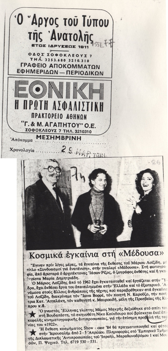 Φωτοαντίγραφο αποκόμματος εφημερίδας, στα ελληνικά, χαρτί, 10,0×8,5 εκ. Δημοσίευμα για τα εγκαίνια της ατομικής έκθεσης ζωγραφικής του Μάριου Λοϊζίδη στην Αθήνα το 1984. Στα εγκαίνια αναφέρεται ότι παραβρέθηκαν οι: Ι. Βορρές, Ν. Καρούζος, Κατ. Αγγελάκη-Ρουκ και κ. Μαυροειδής. Επάνω, επικολημμένο απόκομμα της εταιρίας αποδελτίωσης “Ο Άργος του Τύπου της Ανατολής” με τα στοιχεία της δημοσίευσης.
