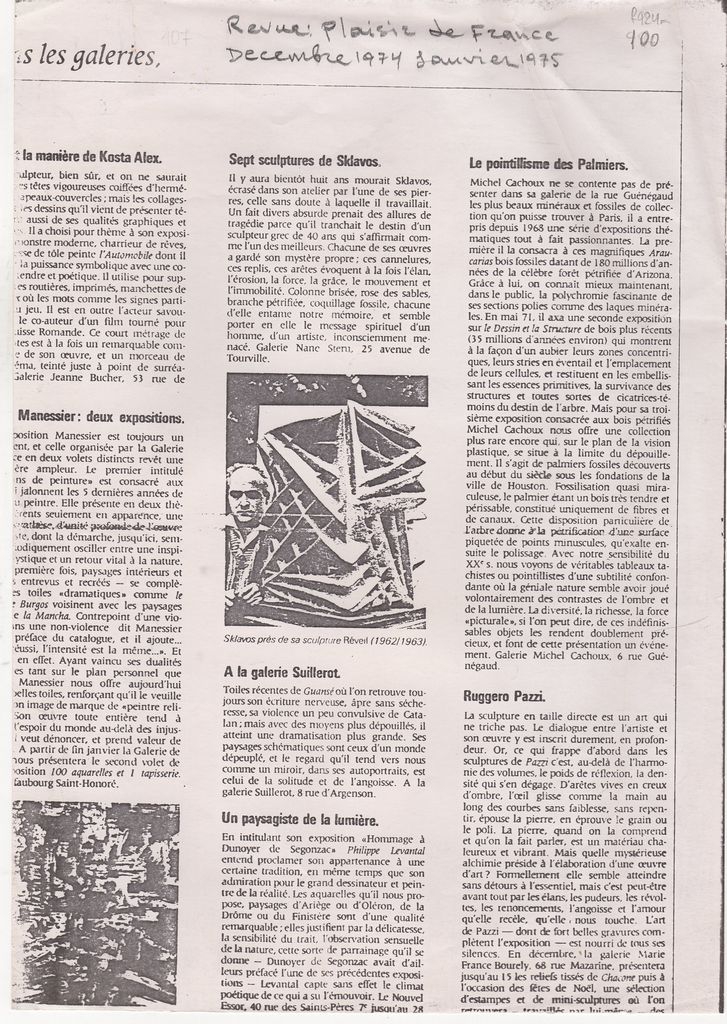Φωτοαντίγραφο, χαρτί, 29,5×21 εκ., στα γαλλικά, δημοσίευσης κριτικής έκθεσης του Γεράσιμου Σκλάβου, η οποία διεξάγεται στο Παρίσι. Στο ίδιο, κριτικές εκθέσεων της περιόδου στο Παρίσι. Ειδικότερα, έκθεση έργων του Guansé, στην γκαλερί “Suillerot”, του Ph. Levantal, με τίτλο “Hommage à Dunoyer et Segonzac”, στην “Le Nouvel Essor”, έκθεση στην γκαλερί “Michel Cachoux” και τέλος αναφορά σε έκθεση γλυτπικής του Ruggero Pazzi.