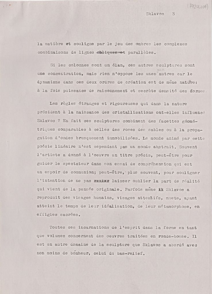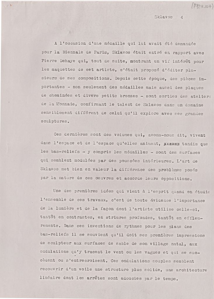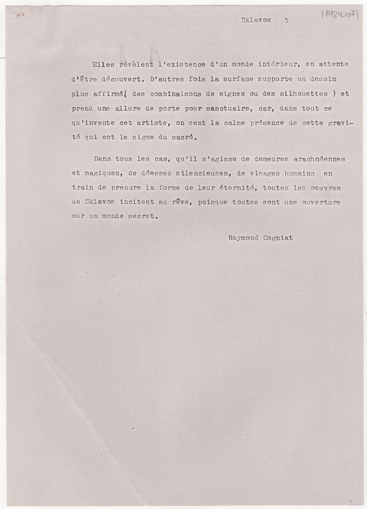Φωτοαντίγραφο, χαρτί, 4 φφ, 29.5×21 εκ., στα γαλλικά. Πρόκειται για κείμενο του Raymond Cogniat αφιερωμένο στον Γεράσιμο Σκλάβο, στο πλαίσιο τιμητικού μεταλίου που σχεδιάστηκε γι’ αυτόν από τον Raymond Joly.