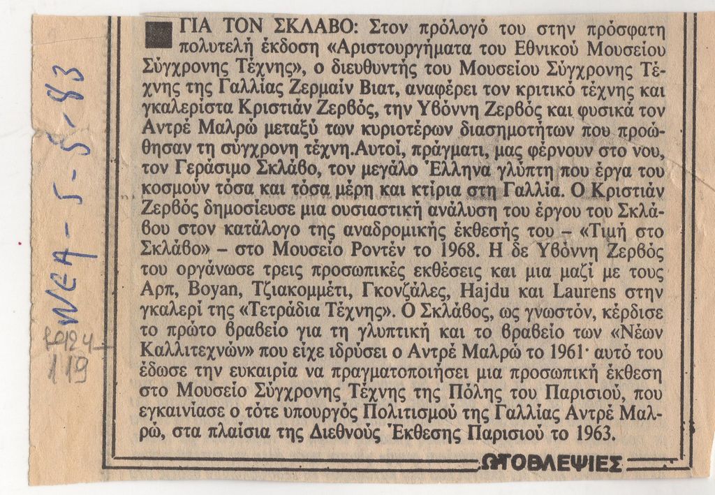 Απόκομμα, χαρτί, 8×11.5 εκ., στα ελληνικά, δημοσίευσης άρθρου αναφερόμενου στους ανθρώπους που τίμησαν μετά τον θάνατό του τον Γεράσιμο Σκλάβο στη Γαλλία.