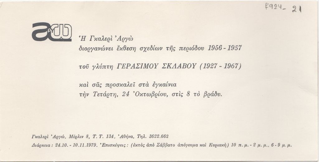 Πρόσκληση, χαρτόνι, 10×20 εκ., στα ελληνικά, εγκαινίων έκθεσης σχεδίων του Γεράσιμου Σκλάβου.