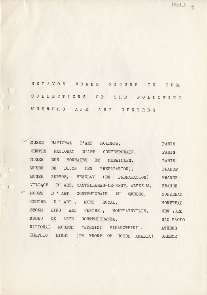 Κατάλογος, δακτυλόγραφος, χαρτί, 8 φφ, 30×21 εκ., στα αγγλικά, εκθέσεων και συλλογών έργων του Γεράσιμου Σκλάβου. Φέρει πλήρη τίτλο “Sklavos works figure in the collections of the following Museum and Art Centers”.