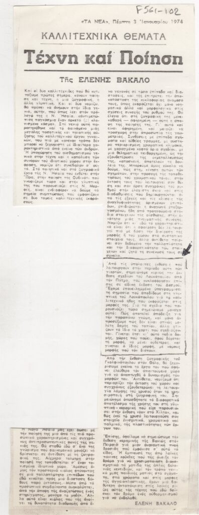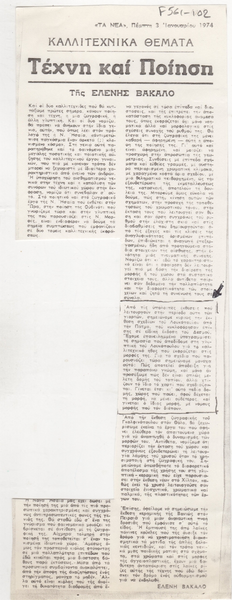 Φωτοαντίγραφο, χαρτί, 28×10 εκ., στα ελληνικά, δημοσιεύσεων κριτικών εκθέσεων των Νανάς Ησαϊα, Γκολφινόπουλου, Βανιώς και Κλέαρχου Λουκόπουλου στην Αθήνα.