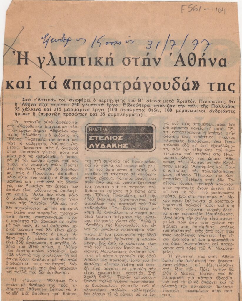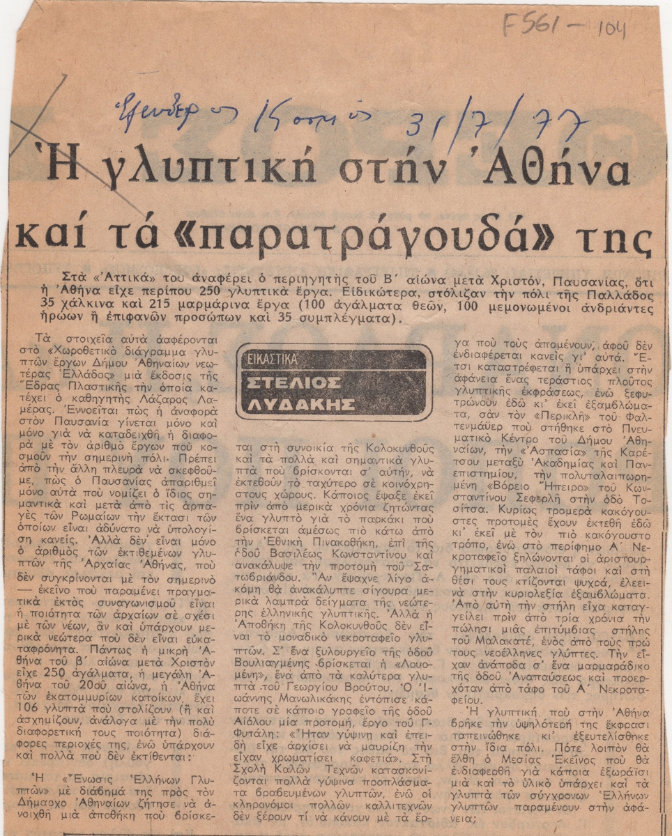 Απόκομμα, χαρτί, 19,5×15,5 εκ., στα ελληνικά, δημοσίευσης άρθρου αναφερόμενου σε γλυπτά του Κλέαρχου Λουκόπουλου τα οποία πρόκεται να κοσμήσουν την Αθήνα.