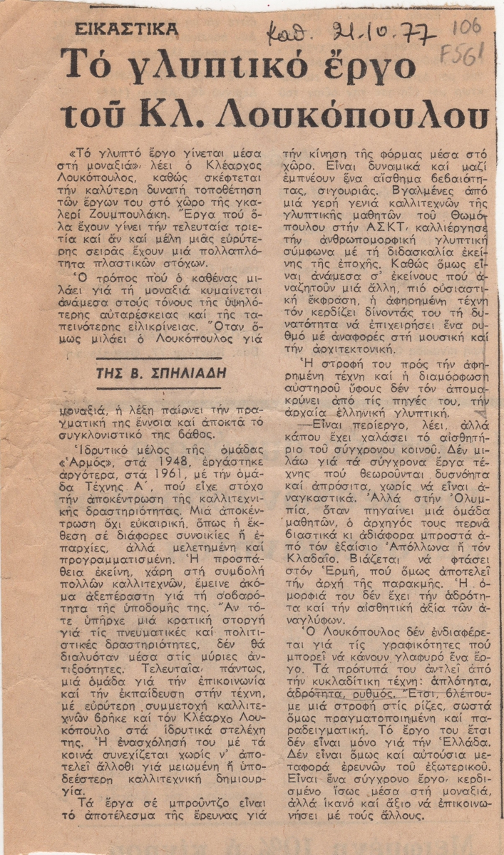 Απόκομμα, χαρτί, 19,5×11,5 εκ., στα ελληνικά, δημοσίευσης κριτικής έκθεσης του Κλέαρχου Λουκόπουλου, η οποία διεξάγεται στην Γκαλερί Ζουμπουλάκη, στην Αθήνα.