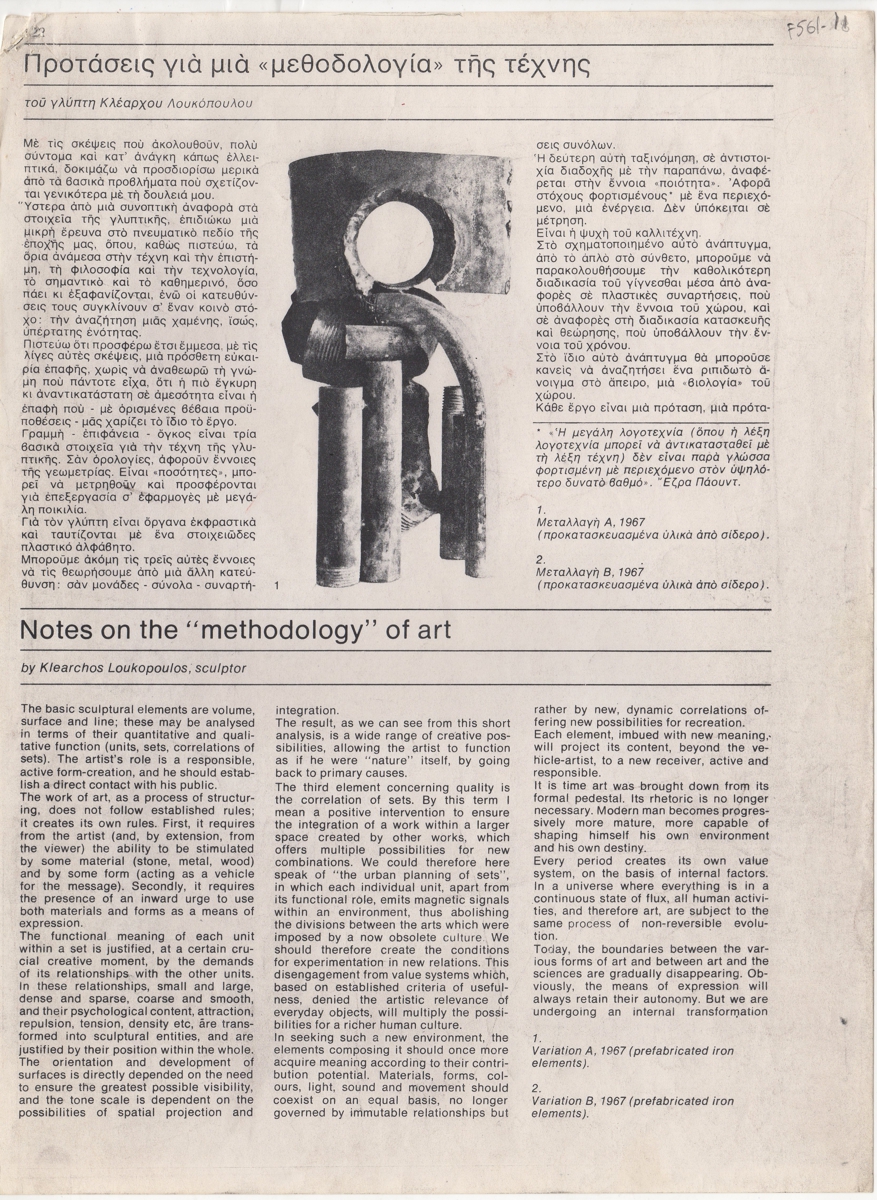 Φωτοαντίγραφο αποκόμματος εντύπου, χαρτί, 8 φφ, 28,5×21 εκ., στα ελληνικά, με κείμενο του Κλέαρχου Λουκόπουλου ιθγ ατην Τέχνη. Το κείμενο συμπληρώνει εικονογράφηση, με αναπαραγωγές έργων του καλλιτέχνη. Δίνεται αγγλική περίληψη.