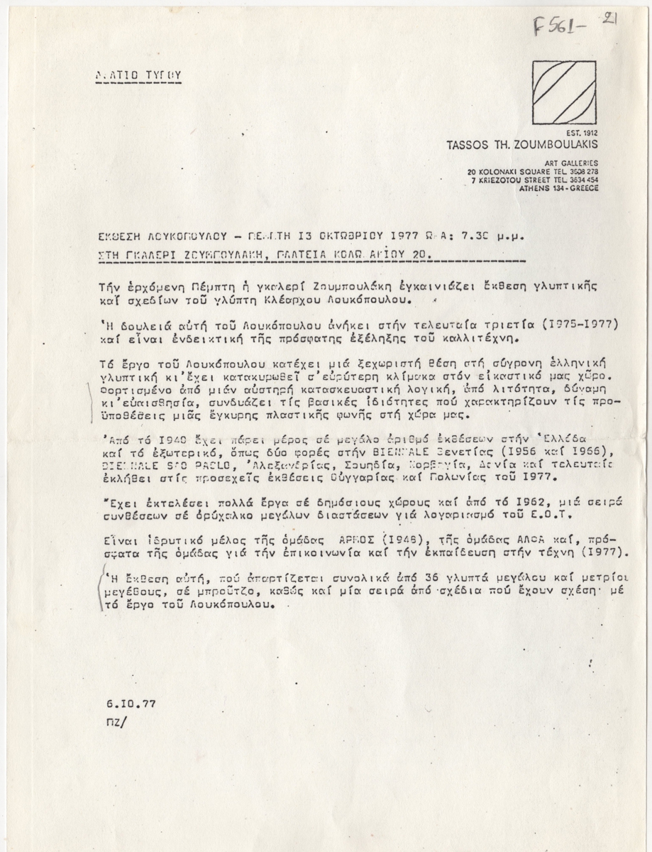 Δελτίο Τύπου, δακτυλόγραφο, χαρτί, 29×21 εκ., στα ελληνικά, έκθεσης του Κλέαρχου Λουκόπουλου. Δίνονται βιογραφικά και πληροφορίες για το έργο που παρουσιάζεται.