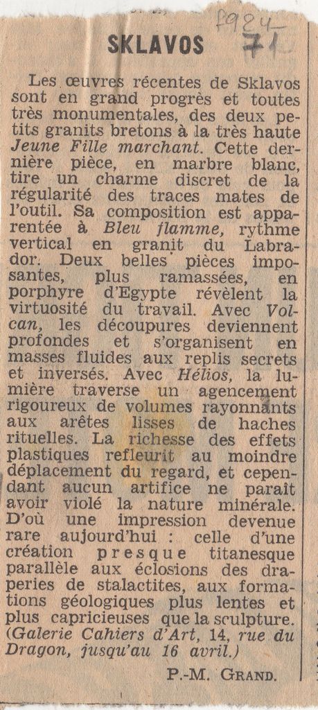 Απόκομμα, χαρτί, στα γαλλικά, 11×5.5 εκ., δημοσίευσης κριτικής έκθεσης του Γεράσιμου Σκλάβου στο Παρίσι.