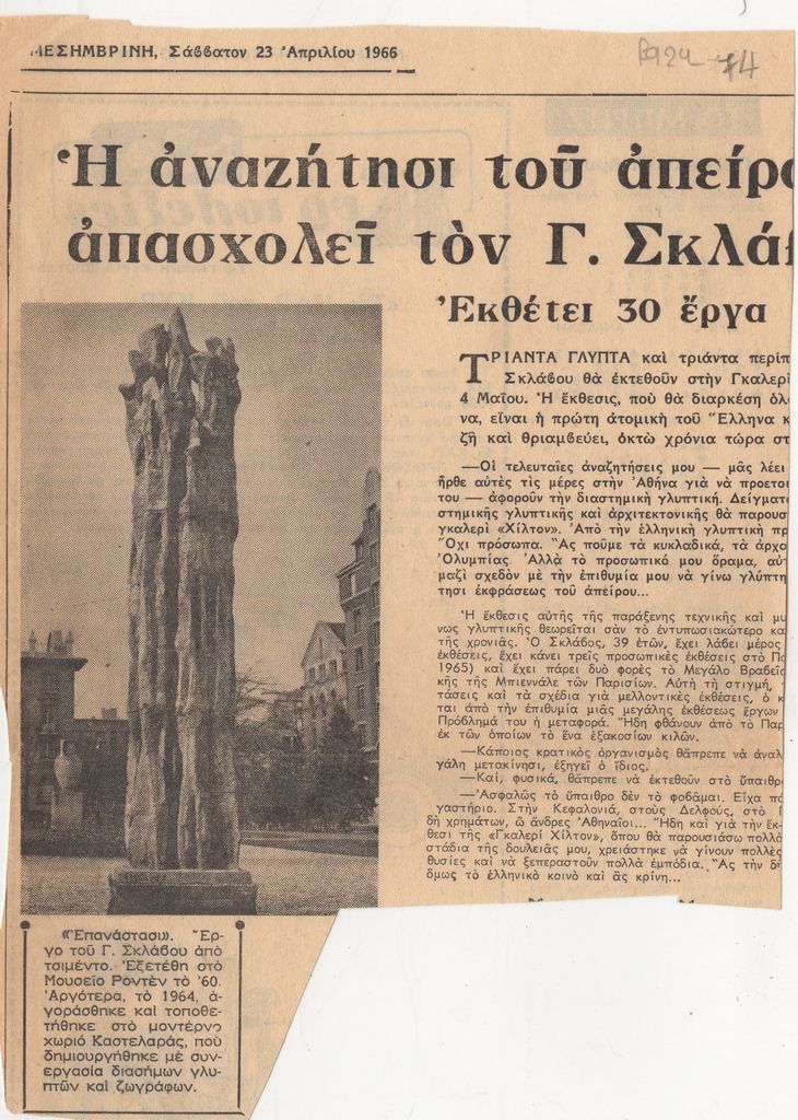 Απόκομμα, χαρτί ακανόνιστου μεγέθους, στα ελληνικά, δημοσίευσης άρθρου αναφερόμενου σε επικείμενα εγκαίνια έκθεσης του Γεράσιμου Σκλάβου, στην Αθήνα.