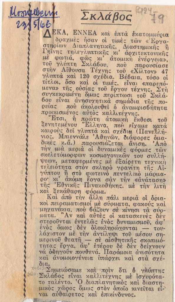 Απόκομμα, χαρτί, 13×7.5 εκ., στα ελληνικά, δημοσίευσης κριτικής έκθεσης του Γεράσιμου Σκλάβου στην Αθήνα.