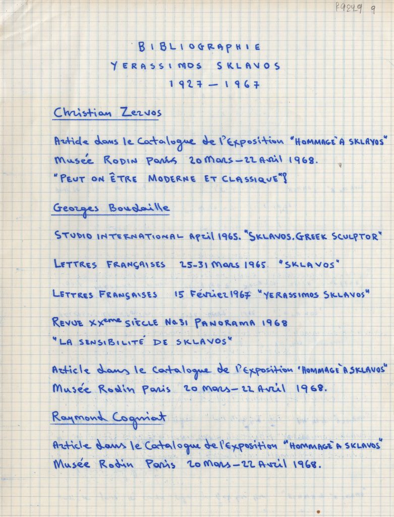 Βιβλιογραφία, χειρόγραφη, χαρτί, 5 φφ, 28×21 εκ., στα γαλλικά, για τον Γεράσιμο Σκλάβο.