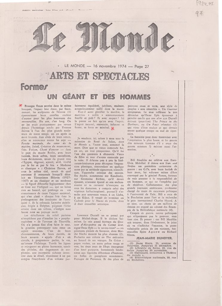 Φωτοαντίγραφο, χαρτί, 29.5×21 εκ., στα γαλλικά, δημοσίευσης άρθρου αναφερόμενου σε αναδρομική έκθεση του Γεράσιμου Σκλάβου στο Παρίσι.