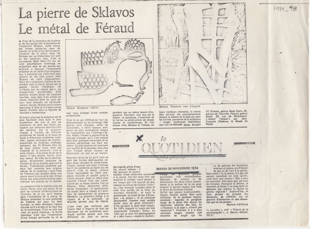 Φωτοαντίγραφο, χαρτί, 21×28 εκ., στα γαλλικά, δημοσίευσης κριτικής έκθεσης του Γεράσιμου Σκλάβου στο Παρίσι. Στο ίδιο σχολιάζεται η γλυπτική του Albert Féraud και συγκρίνεται το έργο των δύο καλλιτεχνών.