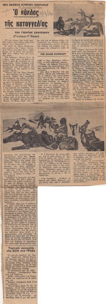 Απόκομμα, χαρτί ακανόνιστου μεγέθους, στα ελληνικά, δημοσίευσης κριτικής έκθεσης του Γιώργου Σκοτεινού, στο Καλλιτεχνικό Πνευματικό Κέντρο Ώρα στην Αθήνα. Πρόκειται για έκθεση του καλλιτέχνη με έργα που εκφράζουν τη δυσαρέσκειά του για την πολιτική κατάσταση στην Κύπρο.