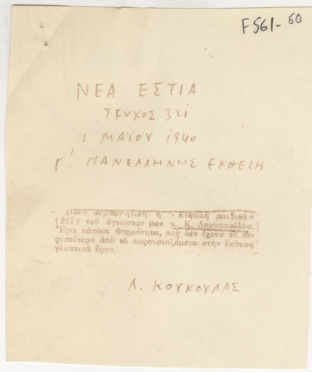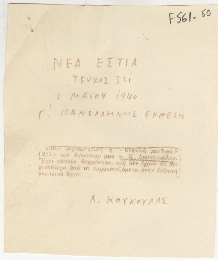 Απόκομμα, χαρτί, 12×10 εκ., στα ελληνικά, δημοσίευσης κριτικής έκθεσης του Κλέαρχου Λουκόπουλου, με το οποίο συμμετέχει στη Γ’ Πανελλήνιο Έκθεση.