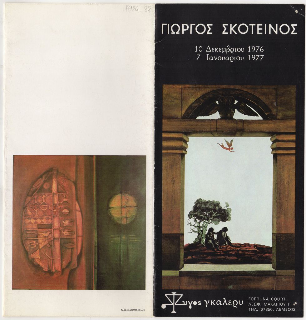 Έντυπο, χαρτόνι δίπτυχο, 23×11 εκ., στα ελληνικά, έκθεσης του Γιώργου Σκοτεινού στη Λεμεσό. Περιέχει κείμενο του Γιώργου Μανουσάκη με τίτλο “Οι πανάρχαιες ρίζες”, βιογραφικό σημείωμα του καλλιτέχνη και εικονογράφηση.
