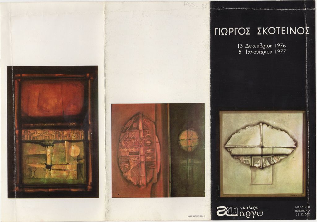 Έντυπο, χαρτόνι δίπτυχο, 23×11 εκ., στα ελληνικά, έκθεσης του Γιώργου Σκοτεινού στην Αθήνα. Περιέχει κείμενο του Γιώργου Μανουσάκη με τίτλο “Οι πανάρχαιες ρίζες” και βιογραφικό σημείωμα του καλλιτέχνη.