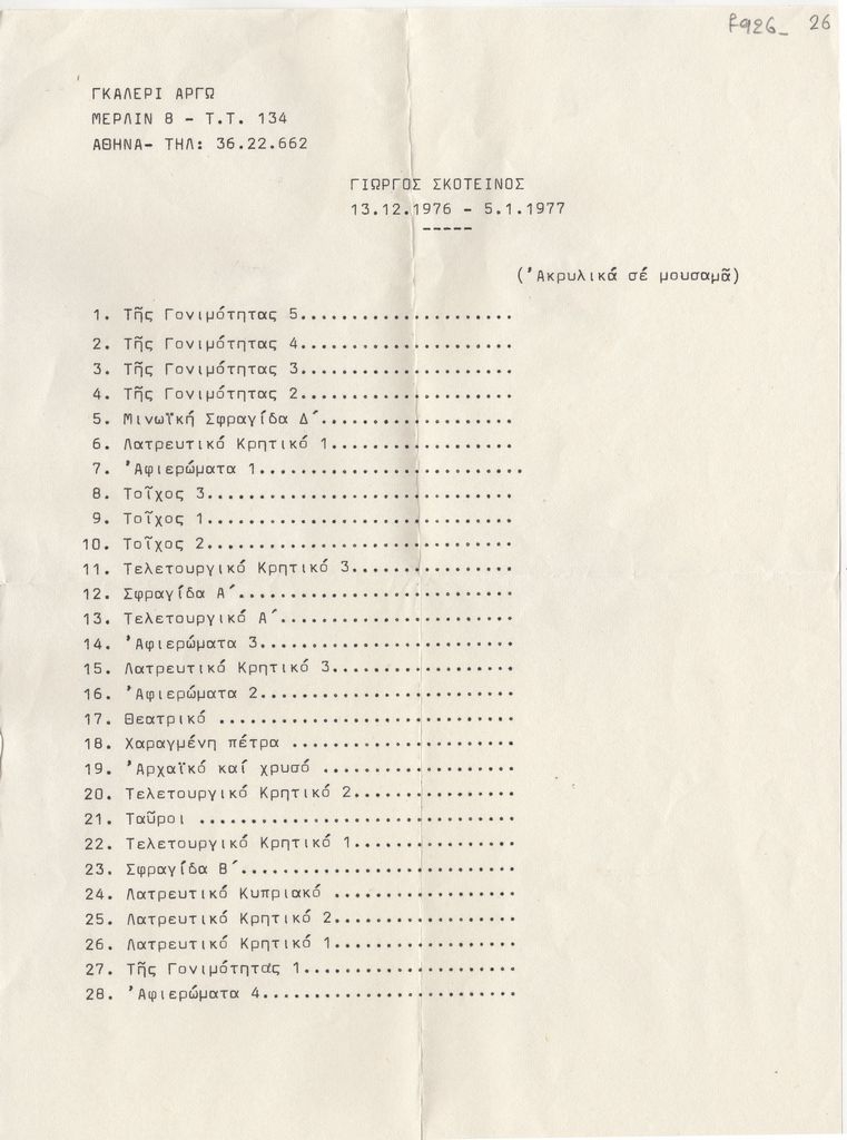 Φωτοαντίγραφο, χαρτί, 29.5×21 εκ., στα ελληνικά, καταλόγου έργων του Γιώργου Σκοτεινού που παρουσιάζονται σε έκθεσή του στην Αθήνα.
