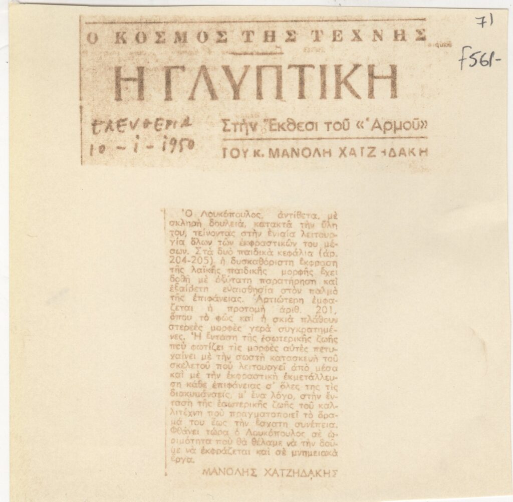 Φωτοαντίγραφο, χαρτί, 14×14 εκ., στα ελληνικά, δημοσίευσης κριτικής για το έργο του Κλέαρχου Λουκόπουλου που παρουσιάζει σε ομαδική έκθεση της Καλλιτεχνικής Ομάδας “Αρμός”.