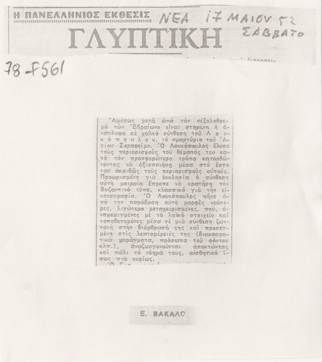 Φωτοαντίγραφο, χαρτί, 13×11.5 εκ., στα ελληνικά, δημοσίευσης κριτικής συμμετοχής τουΚλέαρχου Λουκόπουλου στην Δ’ Πανελλήνιο Έκθεση.