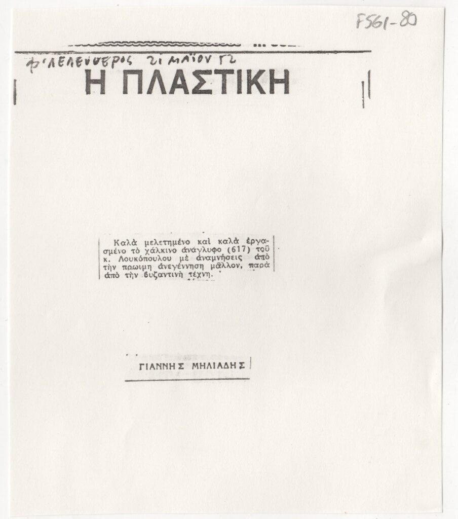 Φωτοαντίγραφο, χαρτί, 14,5×12 εκ., στα ελληνικά, δημοσίευσης κριτικής συμμετοχής του Κλέαρχου Λουκόπουλου, στην Δ’ Πανελλήνιο Έκθεση.