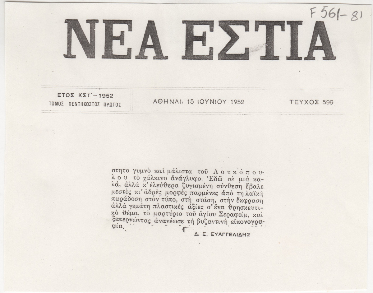 Απόκομμα, χαρτί, 12,5×15,5 εκ., στα ελληνικά, δημοσίευσης κριτικής συμμετοχής του Κλέαρχου Λουκόπουλου στην Δ΄ Πανελλήνιο Έκθεση στην Αθήνα το 1952.