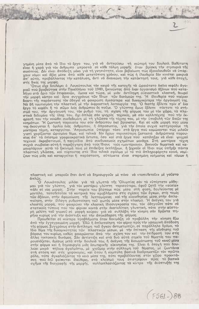 Φωτοαντίγραφο, χαρτί, 4 φφ, 25×16,5 εκ., στα ελληνικά, δημοσίευσης άρθρου αναφερόμενου στην καλλιτεχνική δραστηριότητα του Κλέαρχου Λουκόπουλου. Εντάσσεται σε σειρά άρθρων του εντύπου για καλλιτέχνες που δεν εμφανίζονται συχνά σε εκθέσεις, των οποίων όμως το έργων είναι άξιο αναφοράς.