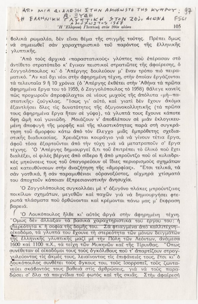 Φωτοαντίγραφο, χαρτί, 3 φφ, 22×14,5 εκ., στα ελληνικά, δημοσίευσης διάλεξης του Αλέξανδρου Ξύδη για τον Κλέαρχο Λουκόπουλο.